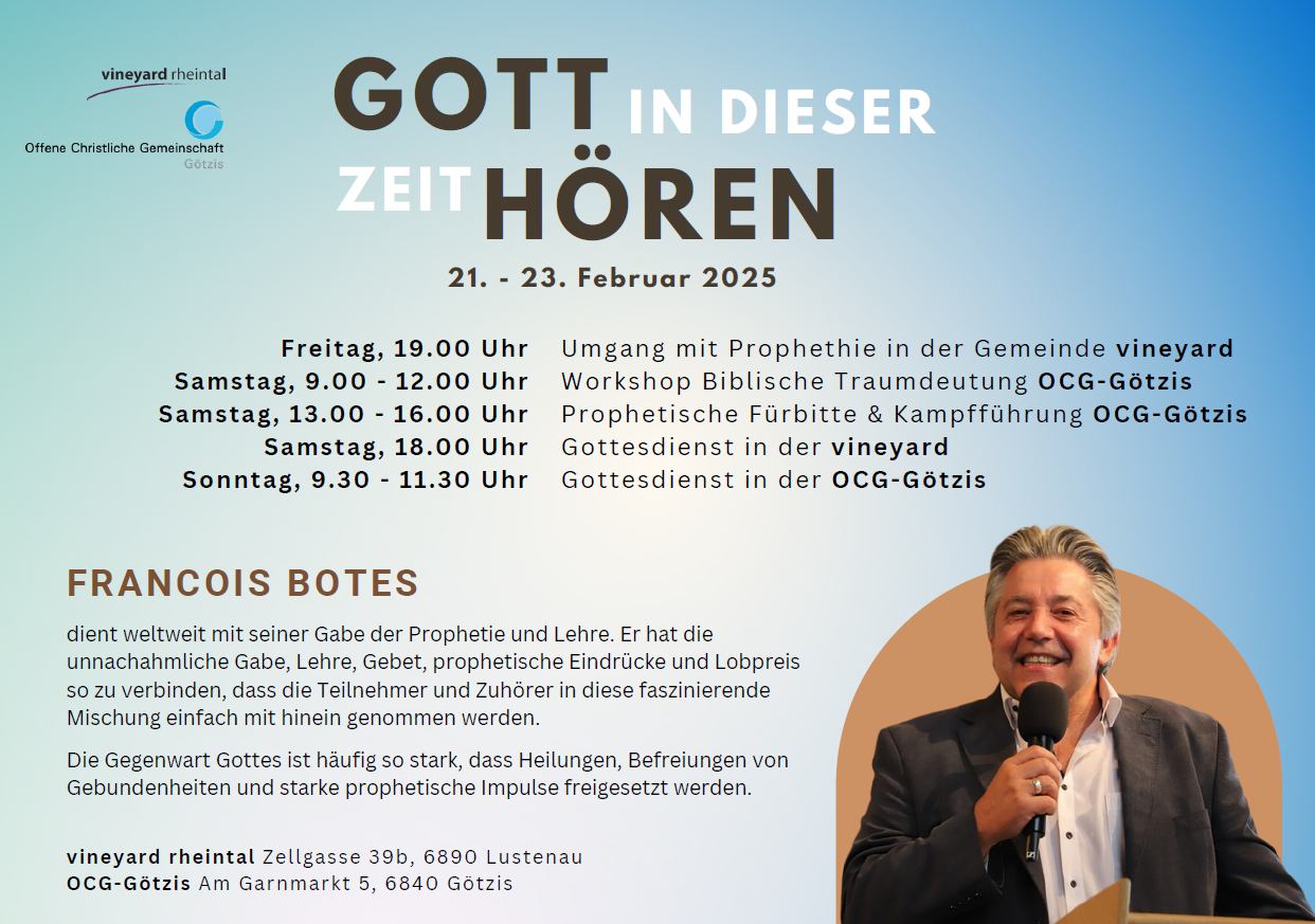 | Samstag 22.02.2025, | 13:00-16:00 Uhr | OCG-Götzis | Prophetische Fürbitte & Kampfführung |